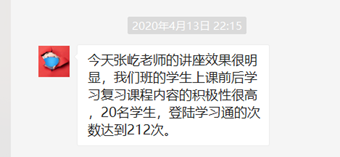 教学导师反馈了课堂的教学效果:“今天张屹老师的讲座效果很明显,我们班的学生上课前后学习复习课程内容的积极性很高,20名学生,登陆学习通的次数达到212次。”