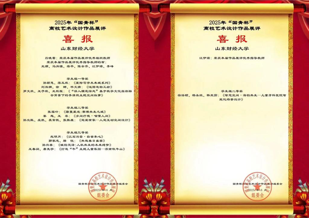 学子在比赛中成绩斐然。其中孙颖慧、蒋玉欣团队的《星际写字未来城系列》,刘效楠、徐娜、毕文婧团队的《涟漪造物工坊》,罗文欣、王子欣、王秋程团队的《“误入藕花深处”基于数字文化旅游融合背景下的李清照主题空间叙事》荣获一等奖;张福岭同学的《碧蔓星途:赛博共生之城》,姜越、王菲团队的《乡间疗境·喵懂人间》,孙立臣、庄凯、袁常凯、张振康团队的《宠爱有家--人宠互动空间设计》,宗洛颐、杨永姣、韩亚茹团队的《智愈空间·海韵共生--儿童牙科医院智能化场景设计》荣获二等奖;赵明月同学的《以石为鉴·自省本心》,郭家志、滕悦团队的《共赴春日盛宴》,孙兴泰同学的《械韵灵泽:人机共生的未来绮梦》,王春润、唐先宇团队的《打造“牛”主题儿童乐园--济南牧牛山》荣获三等奖。这些获奖作品构思新颖、制作精良,展现了3d黄色动漫
