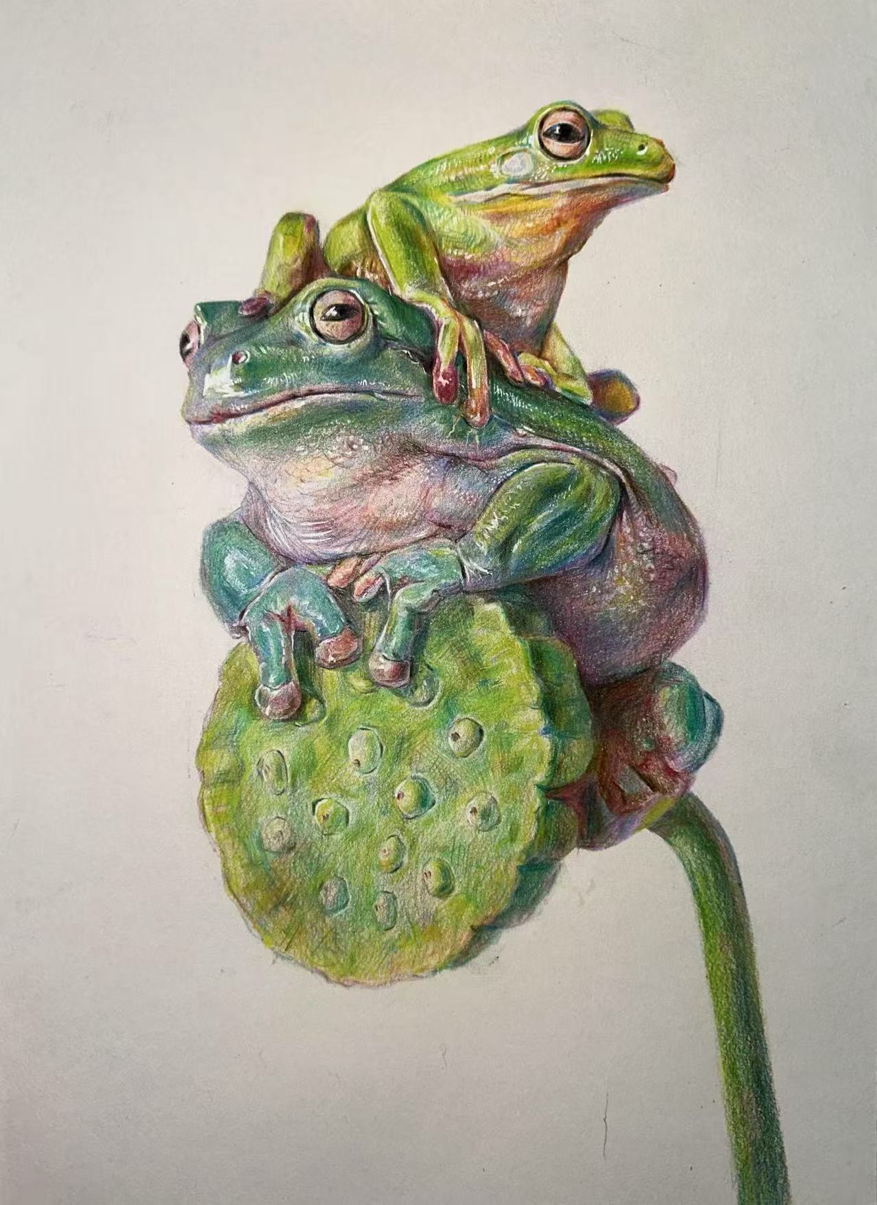 王泠希同学的作品《蛙》描绘了两只青蛙亲昵地栖息于莲蓬之上的生动场景。作品以写实且生动的风格,通过对光影的巧妙处理和细腻的色彩过渡,极大地增强了画面的立体感与层次感。画中青蛙的肌肤质感栩栩如生,莲蓬的细节刻画精致入微,二者形态相映成趣,精准捕捉到了大自然中一个宁静而美好的瞬间,充分展现了彩铅绘画的独特魅力,表达了作者对自然的热爱与赞美。