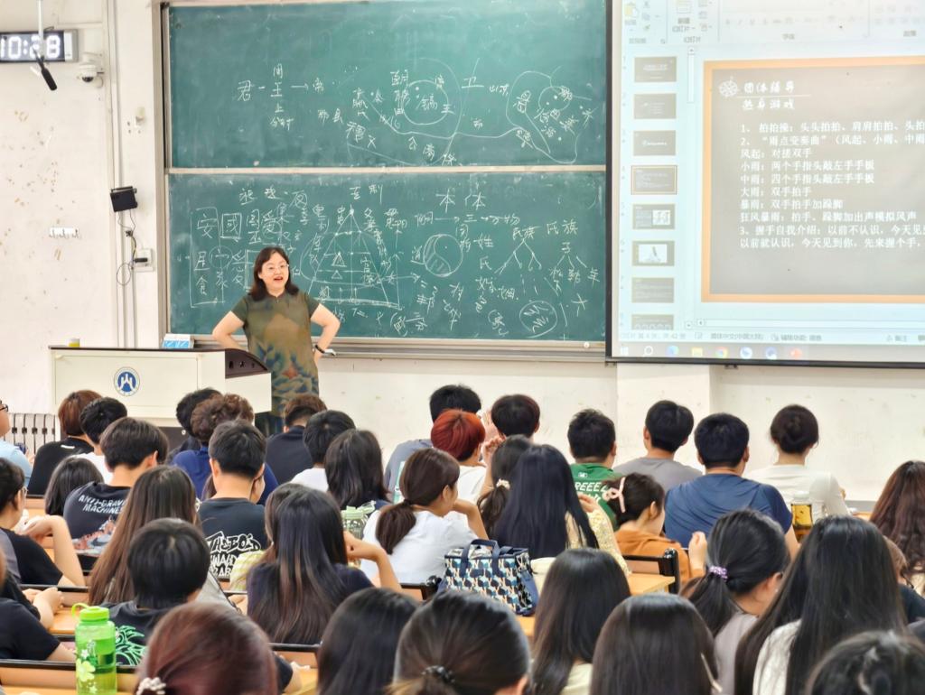 辅导员吕晓蕾和丁柯文围绕团组织建设、《学生手册》学习、学风建设与诚信教育等内容展开系统讲解,鼓励同学们勤奋向学、诚实守信,不断提升自我、服务集体。学院还特别关注新生的心理适应和人文素养培育。刘咏梅老师通过游戏互动和问卷调研等方式,引导大家识别情绪、掌握心理调适方法,并详细介绍了校院两级心理健康支持资源。李敬莲老师为新生开展美育专题教育,组织学唱校歌《梦想花开》,引导大家在歌声中感悟校史底蕴、增强集体认同。