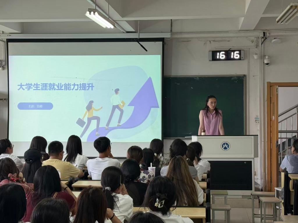 副书记甘超为新生开设“职业生涯规划与就业指导”专题讲座。她建议同学们夯实学业基础,积极参与第二课堂活动、社会实践,合理规划实习实训,积极参与职业规划大赛等赛事,为就业做充分准备。副院长袁慧敏为新生详细解读了专业与课程体系,从“家国情怀”到“你的时代”层层推进,系统梳理专业定位与学业规划,帮助新生建立起清晰的认知框架。