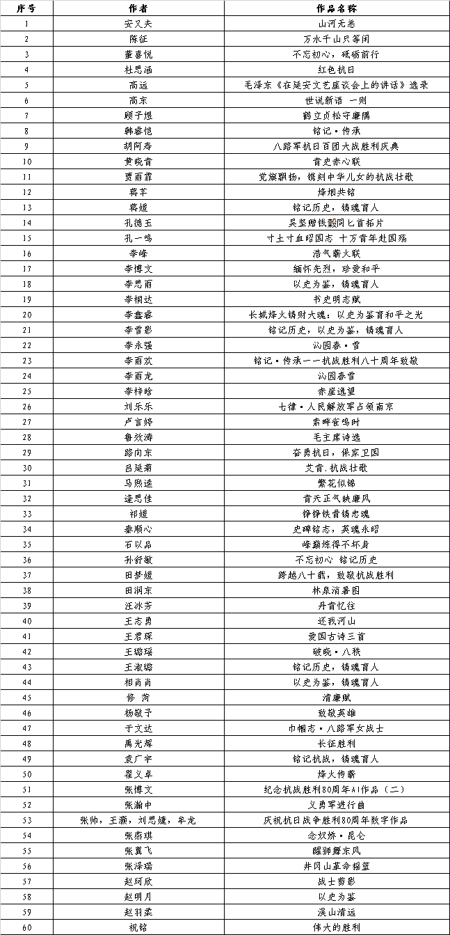 联合举办的纪念中国人民抗日战争暨世界反法西斯战争胜利80周年“以史为鉴•铸魂育人”作品展,经过作品征集与评审环节,现已确定入展作品名单。