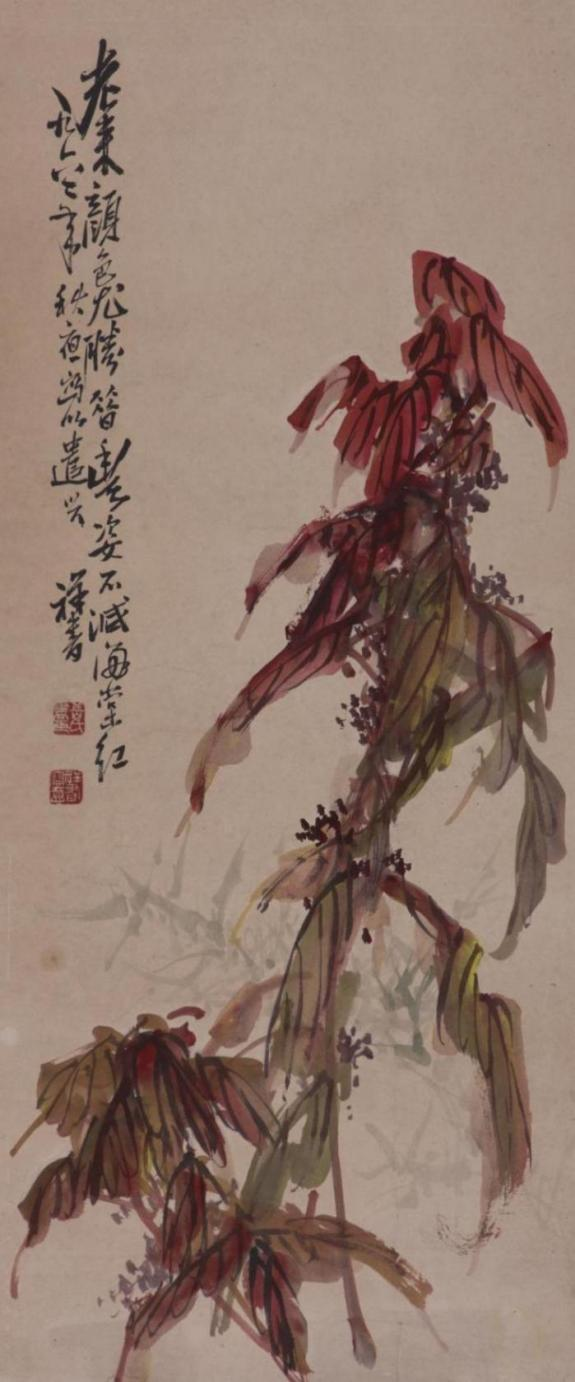 拓展:此幅作品为指画,即用指头代替毛笔等工具蘸墨、颜料作画,是中国传统绘画中的一种特殊画法。潘天寿的指画别具一格,存世数量较大,成就突出。该作品没有题写创作时间,“雷婆头峰寿者”是他晚年(1960年以后)很常见的落款,所以推断应创作于1960年以后。